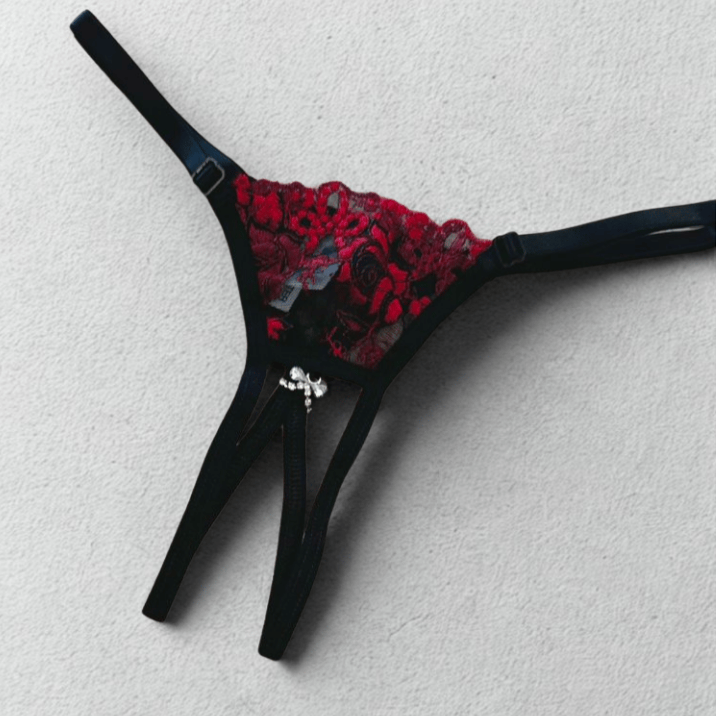 Feita em renda macia e provocante na clássica e elegante combinação de preto com vermelho, ela tem corte fio dental que valoriza o bumbum e uma abertura estratégica na parte inferior que permite a relação sem precisar ser retirada. Confortável, prática e altamente sensual, essa lingerie é perfeita para momentos quentes, em que o toque não espera e o desejo pede passagem. A abertura discreta não marca, não incomoda e se adapta ao corpo, garantindo liberdade total na hora H, sem perder a elegância e o poder de sedução.